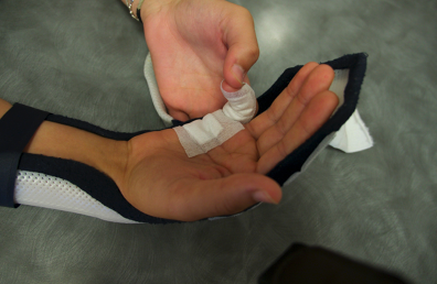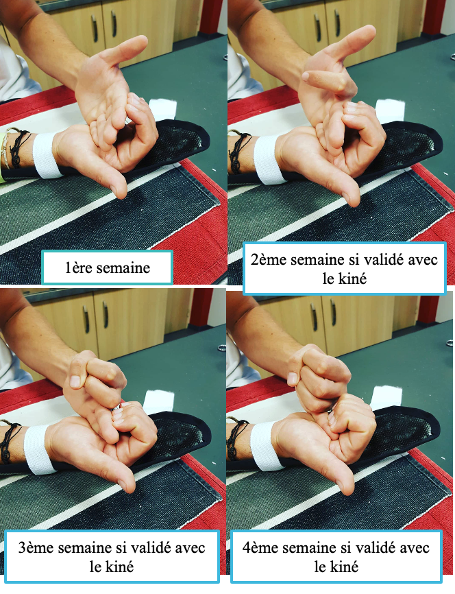 Une fois le doigt assoupli vous pouvez réaliser les exercices préalablement vu avec les kinésithérapeutes en séance. Ne pas forcer. Un faux mouvement ou le non-respect du protocole peut provoquer la rupture de la suture.